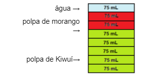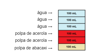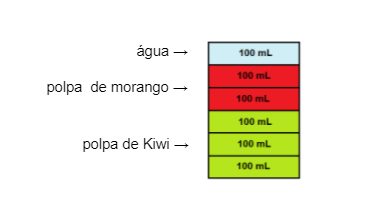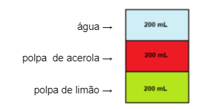 Neste exemplo, há dois tipos de polpa e água. O copo será dividido em três partes, sendo uma parte de polpa de limão, uma parte de polpa de acerola e o restante de água.