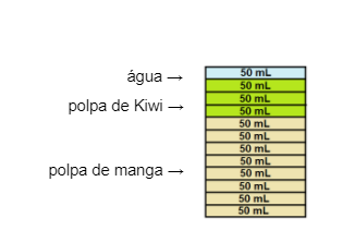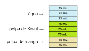 Neste exemplo, há dois tipos de polpa e água. O copo será dividido em oito partes iguais de 75 mL, sendo que o jogador deve colocar duas partes (150 mL) de polpa de manga, três partes (225 mL) de polpa de kiwi e completar o restante com três