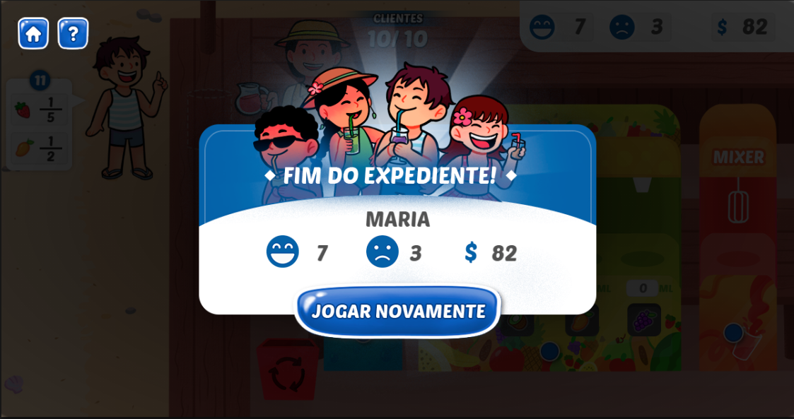 A missão do jogo será concluída quando o jogador atingir a meta de 10 clientes atendidos e que pagaram por aquele pedido. Ao final, aparecerá uma tela indicando a quantidade de moedas e de carinhas satisfeitas e insatisfeitas.